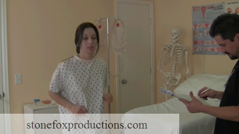 After he has her run in place to check her heart rate, he tells her that the nurse will be in shortly to prepare her for her pelvic exam. As she sits there, Cheryl thinks about grabbing her clothes and leaving, but there isn't enough time before the nurse comes in with a full and bulging enema bag. The nurse explains to Cheryl that she is going to have to have a rectal speculum exam and needs to be cleaned out for that. As the nurse puts castile soap into the bag, she explains that the nozzle will inflate inside of her rectum to help her hold then water.